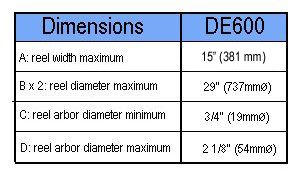 The DE600 is a versatile manual dereeler or reeler, for a reel sizes up to 29” (737mmø) in diameter and weighing up to 200 lbs. (90.7 Kg). Adjustable cones and dog allow use of reels with arbor holes from 3/4” (19mmø) to 2-1/8”(54mmø) I.D. An adjustable friction clutch assembly prevents overruns when dereeling material. Unit can be floor or bench mounted.